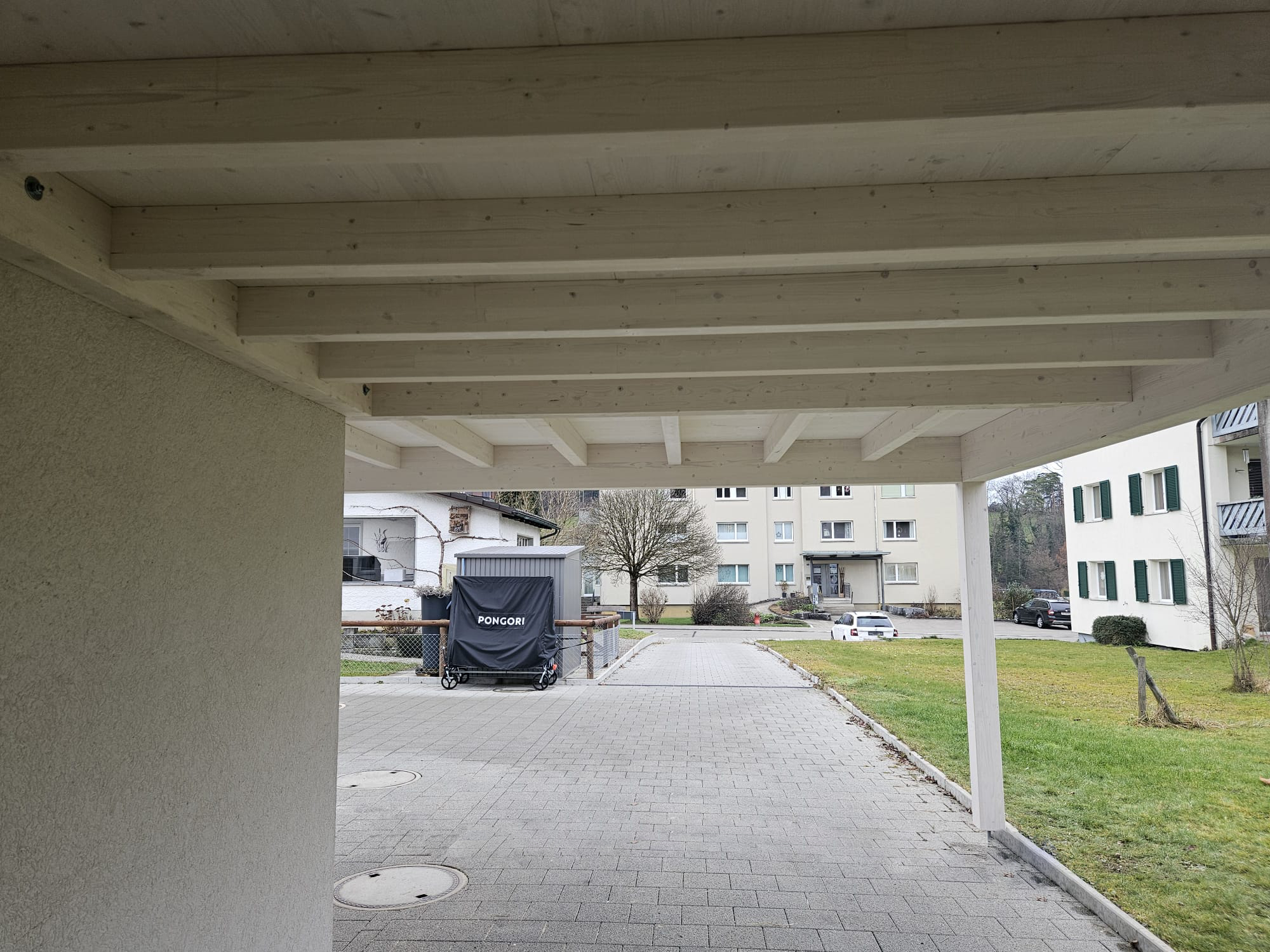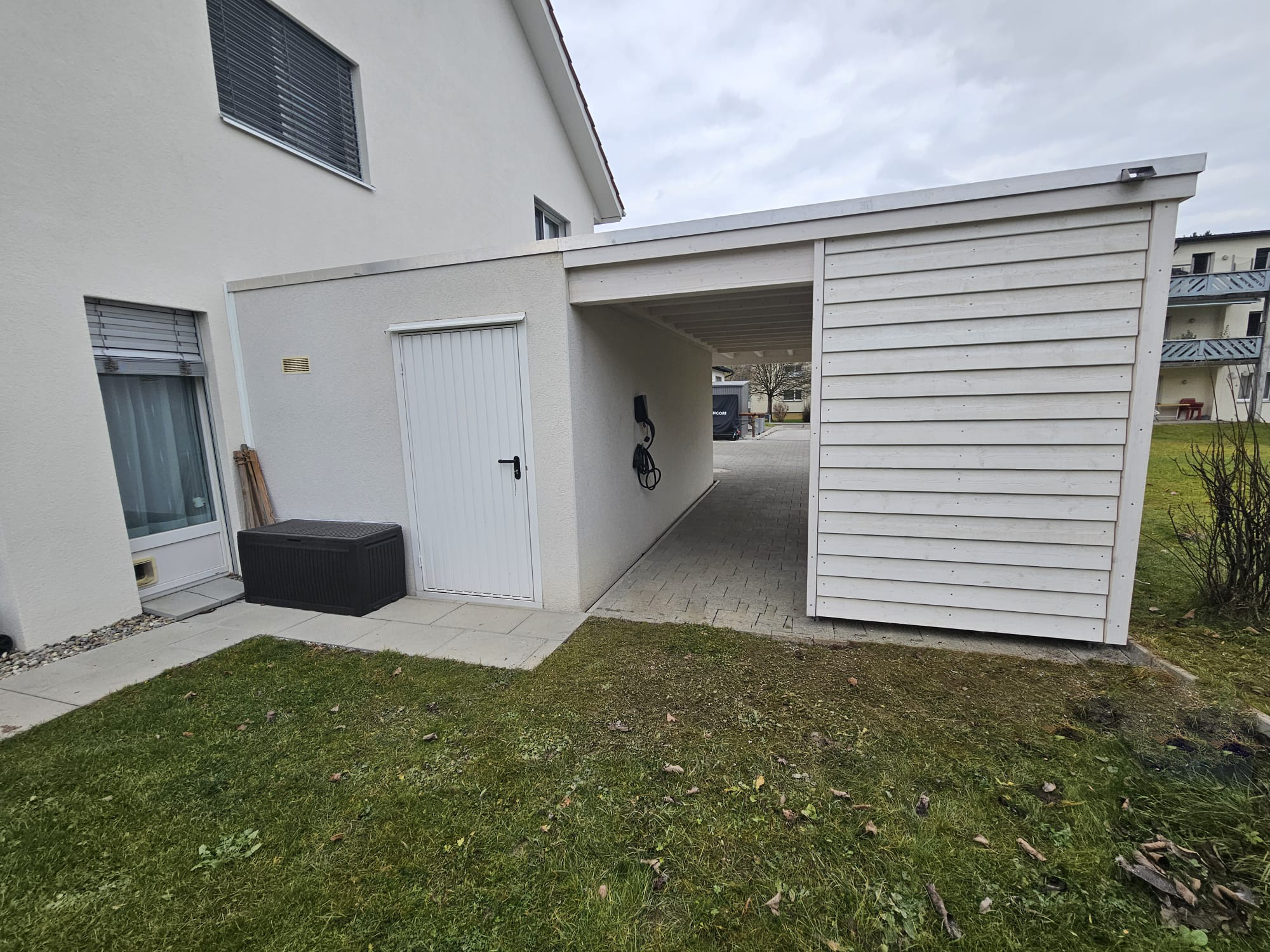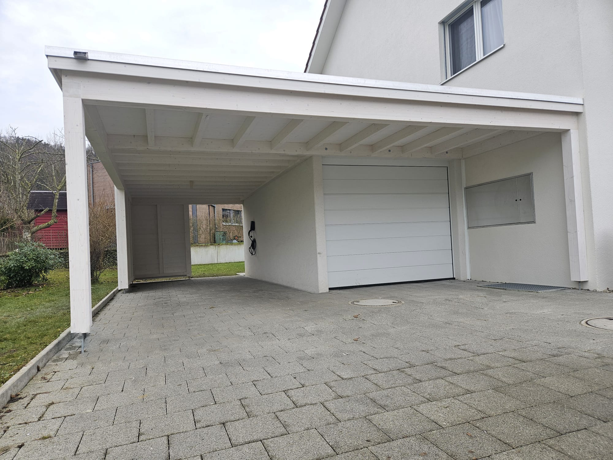 Weisses Holzcarport (weiss gestrichen) inklusive Überdachung angebaut an bestehende Garage,